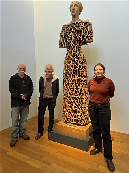 Een van de vele sculpturen in beeldengalerij Het Depot die mij vanaf de eerste aanblik boeide, was het beeld ‘ Sappho’ van beeldhouwer Gerhard Lentink. Hij maakte van deze Griekse dichteres een beeld, opgebouwd uit letters, letters die van de voeten naar de kruin in spiraalvorm de (niet complete) tekst vormen van een van haar gedichten. Fascinerend vond ik het om te zien hoe in dit houten beeld poëzie, beeldende kunst, vormgeving en typografie samenvielen. Onmiddellijk kwam bij mij de wens op om op basis van dit beeld een uitgave te maken die het 45-jarig bestaan van de Atalanta Pers zou vieren. Het was 2023, dus ik had nog een jaar om het idee waar te maken. Ik bezocht de beeldhouwer op zijn atelier en ook zocht ik contact met dichters die mogelijk mee zouden willen werken aan een poëtische dialoog over Sappho. Een man en een vrouw zouden het moeten zijn en natuurlijk zou kennis van de klassieken een pre of misschien wel een voorwaarde zijn. Het werd geen makkelijk traject en het zou nog een paar jaar duren voordat het plan voor deze uitgave ook werkelijkheid zou kunnen gaan worden.